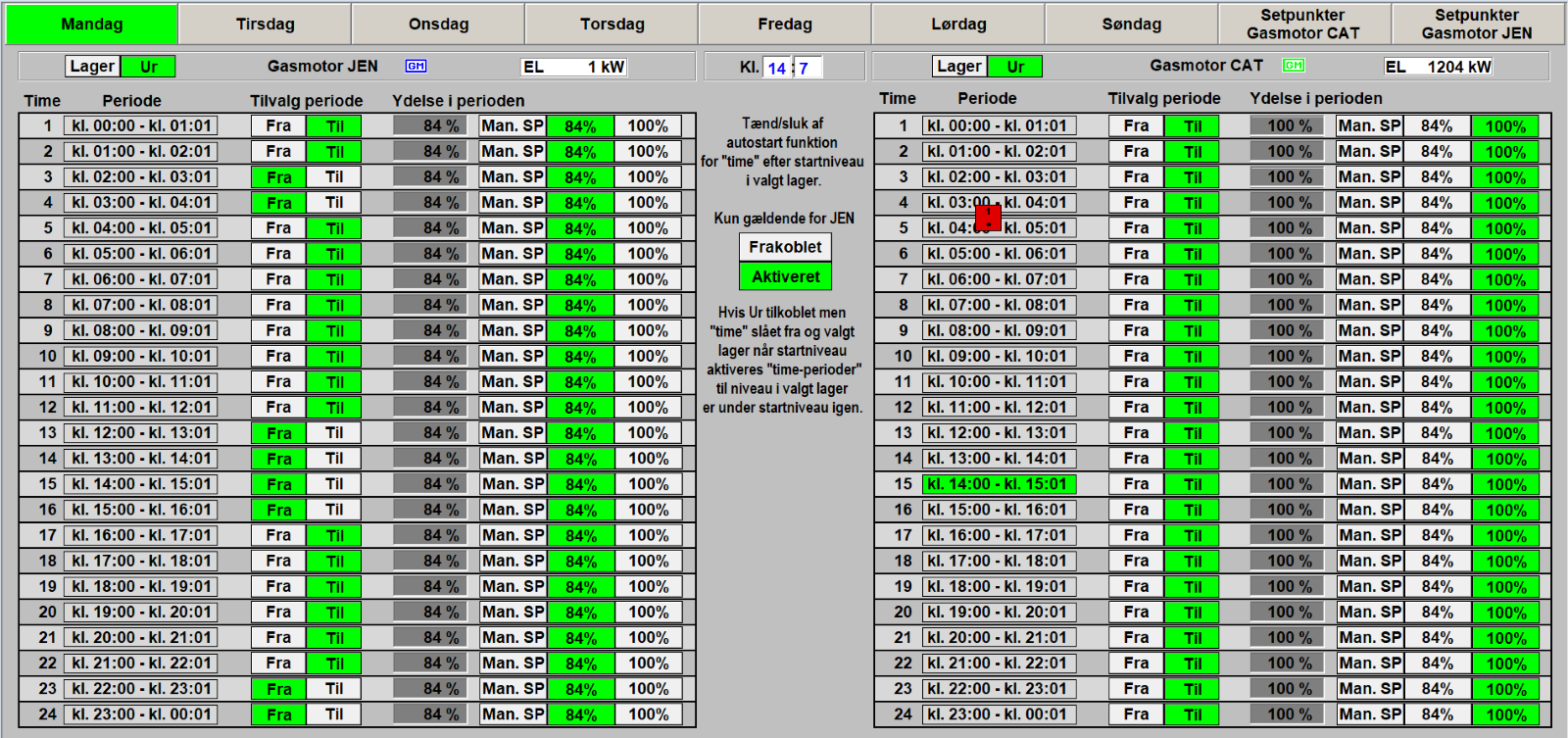 Her ses en gasmotor, der genererer biproduktet EL. Til højre i billedet kan ugeprogrammet tilgås.