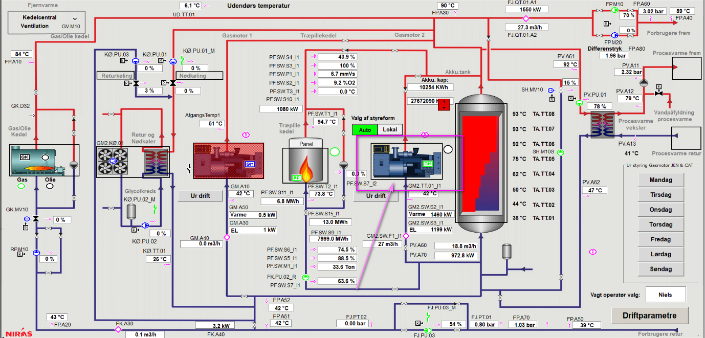 Til processen er der naturligvis indtænkt et eksternt ”data” salgsværktøj, hvor selskabet kan se priser og løbende statistikker for det danske ”el-spot-prismarked”. Mere præcis følges der med i, hvornår el prisen er bedst. NIRAS Automationsingeniører har udviklet et ugeprogram, der inkluderer data fra det eksterne værktøj. Således sammensættes en uge plan for start og stop af gasmotorerne. I ugeplanen bestemmes den ønskede last på gasmotorerne. Derved holdes der øje med hvornår el prisen egner sig til en lav last til varmeproduktion, og hvornår lasten sættes op, så også el produktionen kommer i spil. Ugeplanen er naturligvis indbygget i selve SCADA systemet. Selskabet sælger derved el til det danske elnet. Den helt store gevinst er dog bidragelse til den grønne omstilling.
